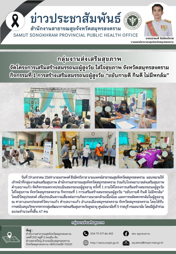 จัดกิจกรรมการตรวจประเมินสมรรถนะผู้สูงอายุ ครั้งที่ 1 ภายใต้โครงการเสริมสร้างสมรรถนะผู้สูงวัย ใส่ใจสุขภาพ จังหวัดสมุทรสงคราม
