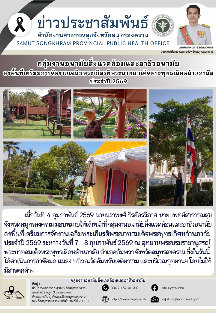 เมื่อวันที่ 4 กุมภาพันธ์ 2569 นายนราพงศ์ ธีรอัครวิภาส นายแพทย์สาธารณสุขจังหวัดสมุทรสงคราม มอบหมายให้เจ้าหน้าที่กลุ่มงานอนามัยสิ่งแวดล้อมและอาชีวอนามัย ลงพื้นที่เตรียมการจัดงานเฉลิมพระเกียรติพระบาทสมเด็จพระพุทธเลิศหล้านภาลัยประจำปี 2569 ระหว่างวันที่ 7 – 8 กุมภาพันธ์ 2569 ณ อุทยานพระบรมราชานุสรณ์ พระบาทสมเด็จพระพุทธเลิศหล้านภาลัย อำเภออัมพวา จังหวัดสมุทรสงคราม ซึ่งในวันนี้ได้ดำเนินการกำจัดมด แมลง บริเวณวัดอัมพวันเจติยาราม และบริเวณอุทยานฯ โดยไม่ให้มีสารตกค้าง