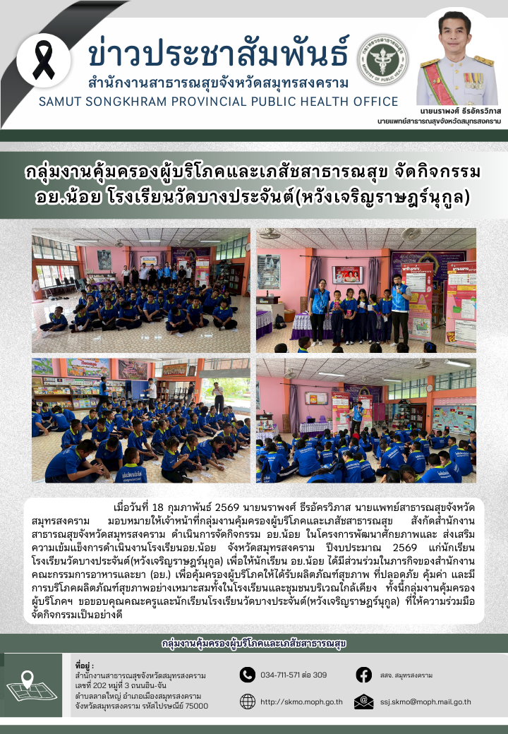 เมื่อวันที่ 18 กุมภาพันธ์ 2569 นายนราพงศ์ ธีรอัครวิภาส นายแพทย์สาธารณสุขจังหวัดสมุทรสงคราม มอบหมายให้เจ้าหน้าที่กลุ่มงานคุ้มครองผู้บริโภคและเภสัชสาธารณสุข ประกอบด้วย นางสาวสุอาภา กลั่นประเสริฐ เภสัชกรชำนาญการ, นายธนศักดิ์ จั่นวิลัย เภสัชกรปฏิบัติการ และนางสาวศุภานัน ลิ้มไกรสรรณ์ เภสัชกร ดำเนินการจัดกิจกรรม อย.น้อย ในโครงการพัฒนาศักยภาพและ ส่งเสริมความเข้มแข็งการดำเนินงานโรงเรียนอย.น้อย จังหวัดสมุทรสงคราม ปีงบประมาณ 2569 แก่นักเรียนโรงเรียนวัดบางประจันต์(หวังเจริญราษฎร์นุกูล) เพื่อให้นักเรียน อย.น้อย ได้มีส่วนร่วมในภารกิจของสำนักงานคณะกรรมการอาหารและยา (อย.) เพื่อคุ้มครองผู้บริโภคให้ได้รับผลิตภัณฑ์สุขภาพ ที่ปลอดภัย คุ้มค่า และมีการบริโภคผลิตภัณฑ์สุขภาพอย่างเหมาะสมทั้งในโรงเรียนและชุมชนบริเวณใกล้เคียง ทั้งนี้กลุ่มงานคุ้มครองผู้บริโภคฯ ขอขอบคุณคณะครูและนักเรียนโรงเรียนวัดบางประจันต์(หวังเจริญราษฎร์นุกูล) ที่ให้ความร่วมมือจัดกิจกรรมเป็นอย่างดี