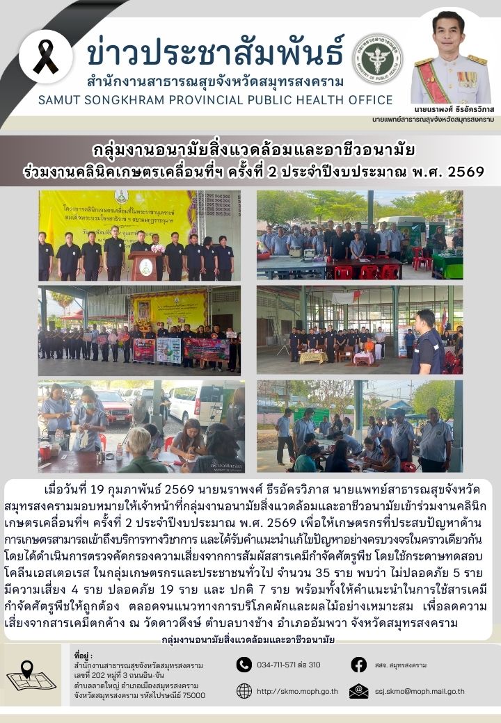 เมื่อวันที่ 19 กุมภาพันธ์ 2569 นายนราพงศ์ ธีรอัครวิภาส นายแพทย์สาธารณสุขจังหวัดสมุทรสงคราม มอบหมายให้เจ้าหน้าที่กลุ่มงานอนามัยสิ่งแวดล้อมและอาชีวอนามัยเข้าร่วมงานคลินิกเกษตรเคลื่อนที่ฯ ครั้งที่ 2 ประจำปีงบประมาณ พ.ศ. 2569 เพื่อให้เกษตรกรที่ประสบปัญหาด้านการเกษตรสามารถเข้าถึงบริการทางวิชาการ และได้รับคำแนะนำแก้ไขปัญหาอย่างครบวงจรในคราวเดียวกัน โดยได้ดำเนินการตรวจคัดกรองความเสี่ยงจากการสัมผัสสารเคมีกำจัดศัตรูพืช โดยใช้กระดาษทดสอบโคลีนเอสเตอเรส ในกลุ่มเกษตรกรและประชาชนทั่วไป จำนวน 35 ราย พบว่า ไม่ปลอดภัย 5 ราย มีความเสี่ยง 4 ราย ปลอดภัย 19 ราย และ ปกติ 7 ราย พร้อมทั้งให้คำแนะนำในการใช้สารเคมีกำจัดศัตรูพืชให้ถูกต้อง ตลอดจนแนวทางการบริโภคผักและผลไม้อย่างเหมาะสม เพื่อลดความเสี่ยงจากสารเคมีตกค้าง ณ วัดดาวดึงษ์ ตำบลบางช้าง อำเภออัมพวา จังหวัดสมุทรสงคราม