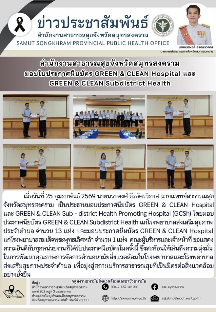 เมื่อวันที่ 25 กุมภาพันธ์ 2569 นายนราพงศ์ ธีรอัครวิภาส นายแพทย์สาธารณสุขจังหวัดสมุทรสงคราม เป็นประธานมอบประกาศนียบัตร GREEN & CLEAN Hospital และ GREEN & CLEAN Sub – district Health Promoting Hospital (GCSh) โดยมอบประกาศนียบัตร GREEN & CLEAN Subdistrict Health แก่โรงพยาบาลส่งเสริมสุขภาพประจำตำบล จำนวน 13 แห่ง และมอบประกาศนียบัตร GREEN & CLEAN Hospital