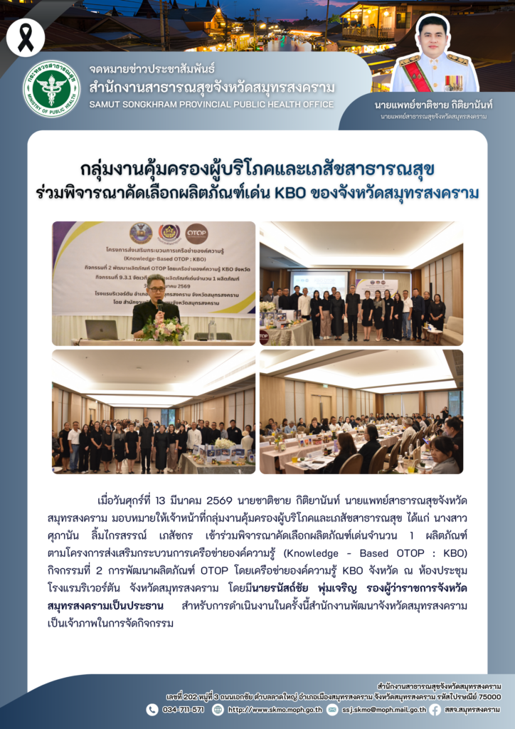 เมื่อวันศุกร์ที่ 13 มีนาคม 2569 นายชาติชาย กิติยานันท์ นายแพทย์สาธารณสุขจังหวัดสมุทรสงคราม มอบหมายให้เจ้าหน้าที่กลุ่มงานคุ้มครองผู้บริโภคและเภสัชสาธารณสุข ได้แก่ นางสาวศุภานัน ลิ้มไกรสรรณ์ เภสัชกร เข้าร่วมพิจารณาคัดเลือกผลิตภัณฑ์เด่นจำนวน 1 ผลิตภัณฑ์ตามโครงการส่งเสริมกระบวนการเครือข่ายองค์ความรู้ (Knowledge – Based OTOP : KBO) กิจกรรมที่ 2 การพัฒนาผลิตภัณฑ์ OTOP โดยเครือข่ายองค์ความรู้ KBO จังหวัด ณ ห้องประชุมโรงแรมริเวอร์ตัน จังหวัดสมุทรสงคราม โดยมีนายรนัสถ์ชัย พุ่มเจริญ รองผู้ว่าราชการจังหวัดสมุทรสงครามเป็นประธาน สำหรับการดำเนินงานในครั้งนี้สำนักงานพัฒนาจังหวัดสมุทรสงครามเป็นเจ้าภาพในการจัดกิจกรรม