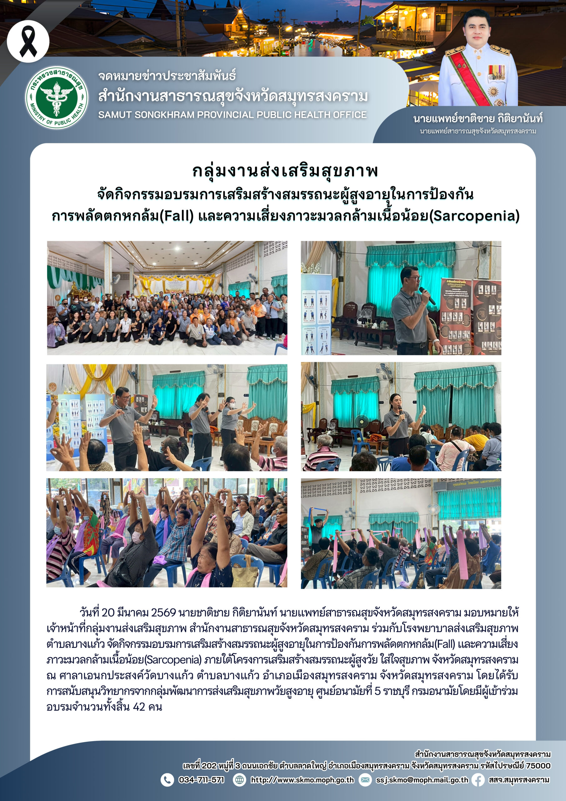 วันที่ 20 มีนาคม 2569 นายชาติชาย กิติยานันท์ นายแพทย์สาธารณสุขจังหวัดสมุทรสงคราม มอบหมายให้เจ้าหน้าที่กลุ่มงานส่งเสริมสุขภาพ สำนักงานสาธารณสุขจังหวัดสมุทรสงคราม ร่วมกับโรงพยาบาลส่งเสริมสุขภาพ ตำบลบางแก้ว จัดกิจกรรมอบรมการเสริมสร้างสมรรถนะผู้สูงอายุในการป้องกันการพลัดตกหกล้ม(Fall) และความเสี่ยงภาวะมวลกล้ามเนื้อน้อย(Sarcopenia) ภายใต้โครงการเสริมสร้างสมรรถนะผู้สูงวัย ใส่ใจสุขภาพ จังหวัดสมุทรสงคราม ณ ศาลาเอนกประสงค์วัดบางแก้ว ตำบลบางแก้ว อำเภอเมืองสมุทรสงคราม จังหวัดสมุทรสงคราม โดยได้รับการสนับสนุนวิทยากรจากกลุ่มพัฒนาการส่งเสริมสุขภาพวัยสูงอายุ ศูนย์อนามัยที่ 5 ราชบุรี กรมอนามัยโดยมีผู้เข้าร่วมอบรมจำนวนทั้งสิ้น 42 คน