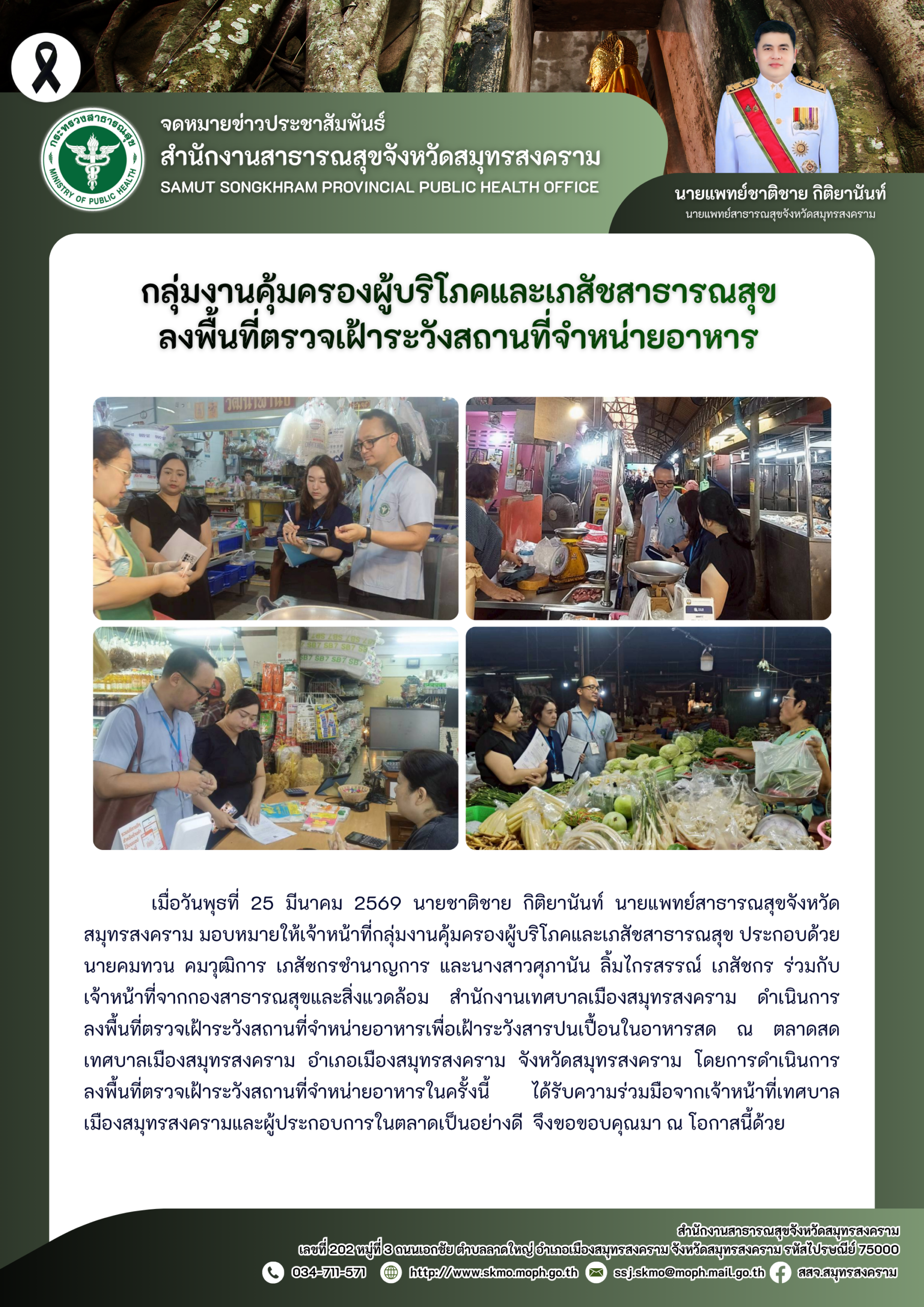 เมื่อวันพุธที่ 25 มีนาคม 2569 นายชาติชาย กิติยานันท์ นายแพทย์สาธารณสุขจังหวัดสมุทรสงคราม มอบหมายให้เจ้าหน้าที่กลุ่มงานคุ้มครองผู้บริโภคและเภสัชสาธารณสุข ประกอบด้วย นายคมทวน คมวุฒิการ เภสัชกรชำนาญการ และนางสาวศุภานัน ลิ้มไกรสรรณ์ เภสัชกร ร่วมกับ เจ้าหน้าที่จากกองสาธารณสุขและสิ่งแวดล้อม สำนักงานเทศบาลเมืองสมุทรสงคราม ดำเนินการลงพื้นที่ตรวจเฝ้าระวังสถานที่จำหน่ายอาหารเพื่อเฝ้าระวังสารปนเปื้อนในอาหารสด ณ ตลาดสดเทศบาลเมืองสมุทรสงคราม อำเภอเมืองสมุทรสงคราม จังหวัดสมุทรสงคราม โดยการดำเนินการลงพื้นที่ตรวจเฝ้าระวังสถานที่จำหน่ายอาหารในครั้งนี้ ได้รับความร่วมมือจากเจ้าหน้าที่เทศบาลเมืองสมุทรสงครามและผู้ประกอบการในตลาดเป็นอย่างดี จึงขอขอบคุณมา ณ โอกาสนี้ด้วย