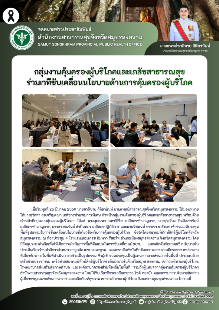 เมื่อวันพุธที่ 25 มีนาคม 2569 นายชาติชาย กิติยานันท์ นายแพทย์สาธารณสุขจังหวัดสมุทรสงคราม ได้มอบหมายให้นางสุวัสสา สุขเจริญคณา เภสัชกรชำนาญการพิเศษ หัวหน้ากลุ่มงานคุ้มครองผู้บริโภคและเภสัชสาธารณสุข พร้อมด้วยเจ้าหน้าที่กลุ่มงานคุ้มครองผู้บริโภคฯ ได้แก่ นางสุมณฑา มหาวิริโย เภสัชกรชำนาญการ, นายรุ่งเรือง กิตติเนาวรัตน์ เภสัชกรชำนาญการ, นางสาวธนวันต์ กำปั่นทอง เภสัชกรปฏิบัติการ และนายนิชนนท์ ชาวเรา เภสัชกร เข้าร่วมเวทีประชุมพื้นที่รูปธรรมในการขับเคลื่อนนโยบายที่เกี่ยวข้องกับการคุ้มครองผู้บริโภค ซึ่งจัดโดยสมาคมพิทักษ์สิทธิผู้บริโภคจังหวัดสมุทรสงคราม ณ ห้องประชุม 4 โรงแรมเดอะเกรซ อัมพวา รีสอร์ท อำเภอเมืองสมุทรสงคราม จังหวัดสมุทรสงคราม โดยมีวัตถุประสงค์หลักเพื่อให้เกิดการดำเนินการพื้นที่ต้นแบบในการขับเคลื่อนนโยบาย และผลักดันข้อเสนอเชิงนโยบายในประเด็นเรื่องร้านชำสีขาวจำหน่ายยาถูกต้องตามมาตรฐาน ตลอดจนจัดทำบันทึกข้อตกลงความร่วมมือระหว่างหน่วยงานที่เกี่ยวข้องภายในพื้นที่ดำเนินการอย่างเป็นรูปธรรม ซึ่งผู้เข้าร่วมประชุมเป็นผู้แทนจากภาคส่วนภายในพื้นที่ ประกอบด้วย เครือข่ายประชาชน, เครือข่ายสมาคมพิทักษ์สิทธิผู้บริโภคระดับอำเภอในจังหวัดสมุทรสงคราม, สภาองค์กรของผู้บริโภค, โรงพยาบาลส่งเสริมสุขภาพตำบล และองค์กรปกครองส่วนท้องถิ่นในพื้นที่ รวมถึงผู้แทนจากกลุ่มงานคุ้มครองผู้บริโภคฯ สำนักงานสาธารณสุขจังหวัดสมุทรสงคราม โดยได้รับเกียรติจากเภสัชกรภาณุโชติ ทองยัง คณะกรรมการนโยบายสัดส่วนผู้เชี่ยวชาญเฉพาะด้านอาหาร ยาและผลิตภัณฑ์สุขภาพ สภาองค์กรของผู้บริโภค จึงขอขอบคุณทุกท่านมา ณ โอกาสนี้