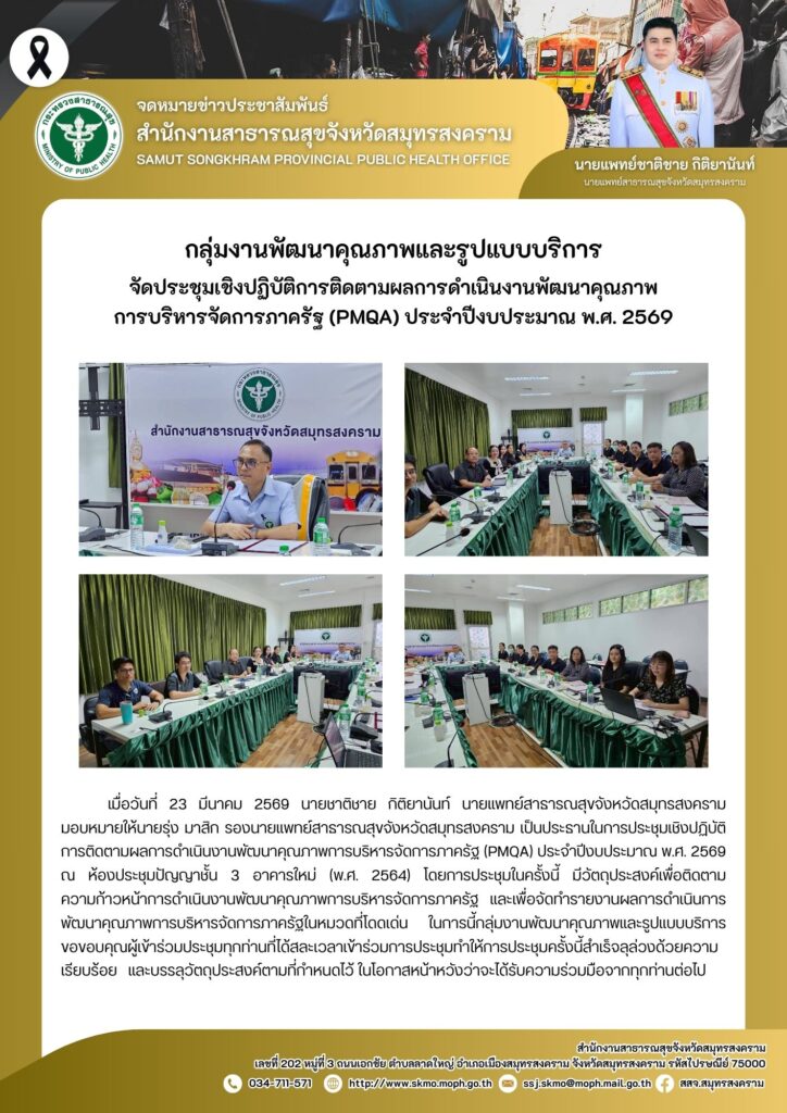 เมื่อวันที่ 23 มีนาคม 2569 นายชาติชาย กิติยานันท์ นายแพทย์สาธารณสุขจังหวัดสมุทรสงคราม มอบหมายให้นายรุ่ง มาสิก รองนายแพทย์สาธารณสุขจังหวัดสมุทรสงคราม เป็นประธานในการประชุมเชิงปฏิบัติการติดตามผลการดำเนินงานพัฒนาคุณภาพการบริหารจัดการภาครัฐ (PMQA) ประจำปีงบประมาณ พ.ศ. 2569 ณ ห้องประชุมปัญญาชั้น 3 อาคารใหม่ (พ.ศ. 2564) โดยการประชุมในครั้งนี้ มีวัตถุประสงค์เพื่อติดตาม ความก้าวหน้าการดำเนินงานพัฒนาคุณภาพการบริหารจัดการภาครัฐ และเพื่อจัดทำรายงานผลการดำเนินการพัฒนาคุณภาพการบริหารจัดการภาครัฐในหมวดที่โดดเด่น ในการนี้กลุ่มงานพัฒนาคุณภาพและรูปแบบบริการขอขอบคุณผู้เข้าร่วมประชุมทุกท่านที่ได้สละเวลาเข้าร่วมการประชุมทำให้การประชุมครั้งนี้สำเร็จลุล่วงด้วยความเรียบร้อย และบรรลุวัตถุประสงค์ตามที่กำหนดไว้ ในโอกาสหน้าหวังว่าจะได้รับความร่วมมือจากทุกท่านต่อไป