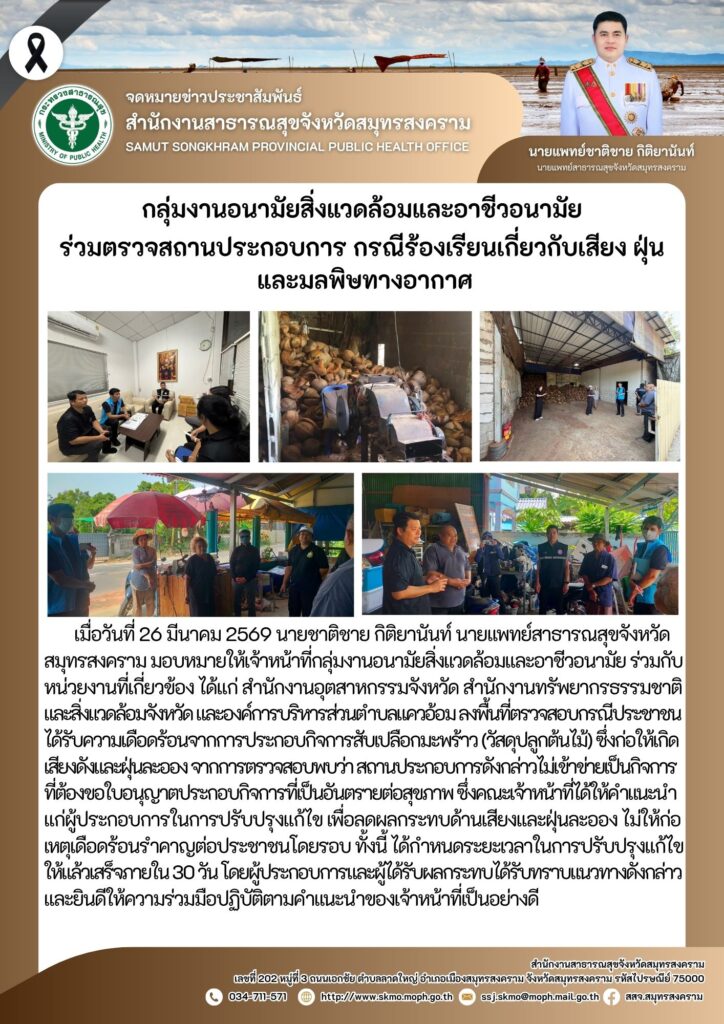 เมื่อวันที่ 26 มีนาคม 2569 นายชาติชาย กิติยานันท์ นายแพทย์สาธารณสุขจังหวัดสมุทรสงคราม มอบหมายให้เจ้าหน้าที่กลุ่มงานอนามัยสิ่งแวดล้อมและอาชีวอนามัย ร่วมกับหน่วยงานที่เกี่ยวข้อง ได้แก่ สำนักงานอุตสาหกรรมจังหวัด สำนักงานทรัพยากรธรรมชาติและสิ่งแวดล้อมจังหวัด และองค์การบริหารส่วนตำบลแควอ้อม ลงพื้นที่ตรวจสอบกรณีประชาชนได้รับความเดือดร้อนจากการประกอบกิจการสับเปลือกมะพร้าว (วัสดุปลูกต้นไม้) ซึ่งก่อให้เกิดเสียงดังและฝุ่นละออง จากการตรวจสอบพบว่า สถานประกอบการดังกล่าวไม่เข้าข่ายเป็นกิจการที่ต้องขอใบอนุญาตประกอบกิจการที่เป็นอันตรายต่อสุขภาพ ซึ่งคณะเจ้าหน้าที่ได้ให้คำแนะนำแก่