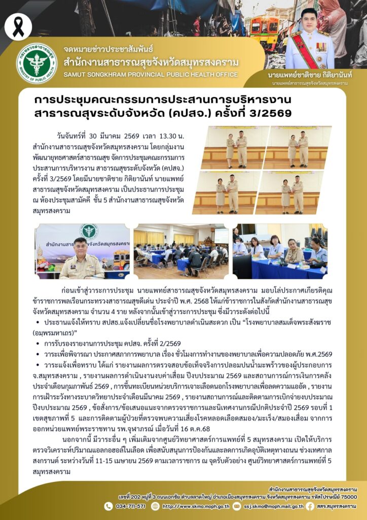 วันจันทร์ที่ 30 มีนาคม 2569 เวลา 13.30 น. สำนักงานสาธารณสุขจังหวัดสมุทรสงคราม โดยกลุ่มงานพัฒนายุทธศาสตร์สาธารณสุข จัดการประชุมคณะกรรมการประสานการบริหารงานสาธารณสุขระดับจังหวัด (คปสจ.) ครั้งที่ 3/2569 โดยมีนายชาติชาย กิติยานันท์ นายแพทย์สาธารณสุขจังหวัดสมุทรสงคราม เป็นประธานในการประชุม ณ ห้องประชุมสามัคคี ชั้น 5 สำนักงานสาธารณสุขจังหวัดสมุทรสงคราม รายละเอียดปรากฏตามภาพข่าวประชาสัมพันธ์