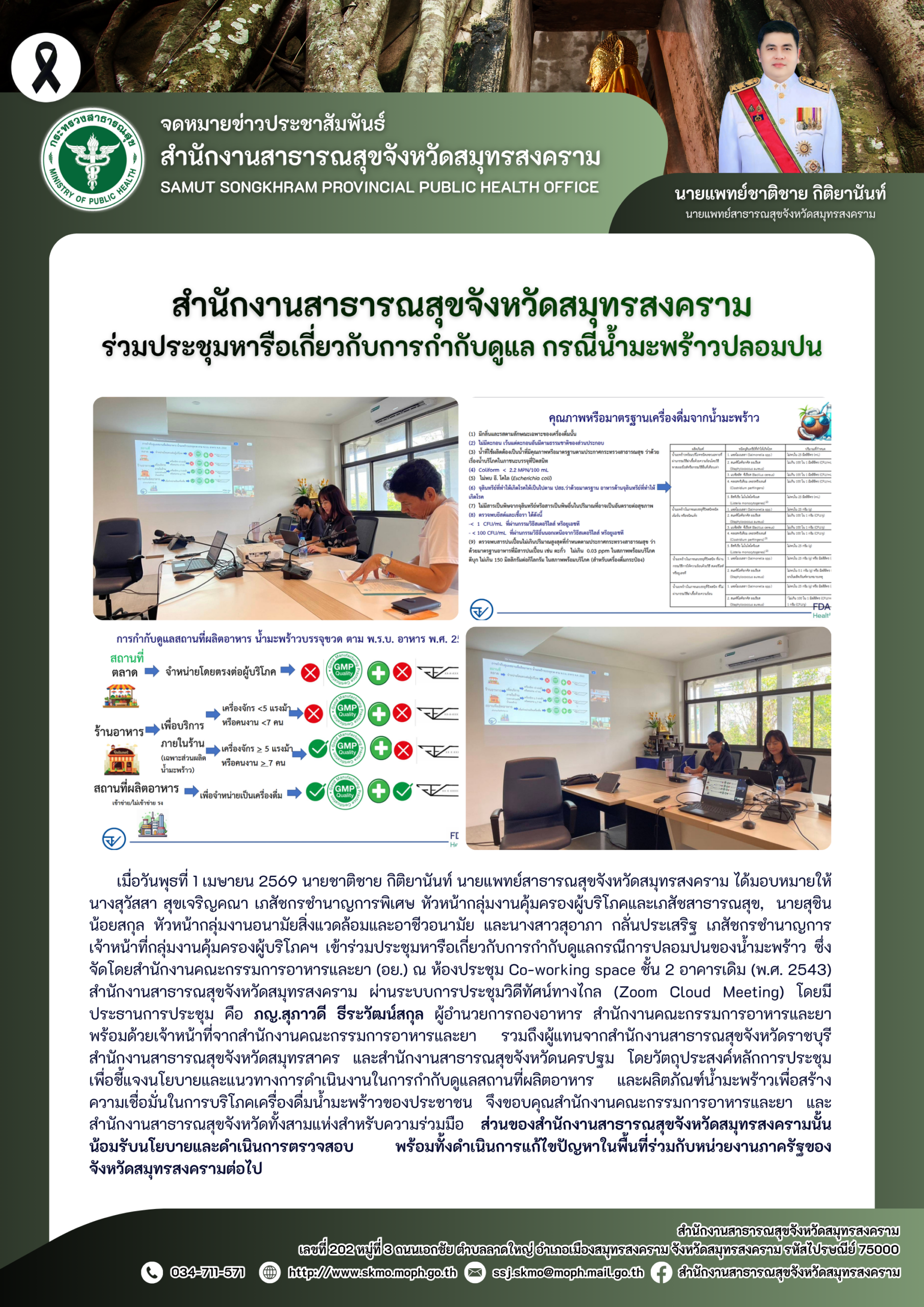 เมื่อวันพุธที่ 1 เมษายน 2569 นายชาติชาย กิติยานันท์ นายแพทย์สาธารณสุขจังหวัดสมุทรสงคราม ได้มอบหมายให้ นางสุวัสสา สุขเจริญคณา เภสัชกรชำนาญการพิเศษ หัวหน้ากลุ่มงานคุ้มครองผู้บริโภคและเภสัชสาธารณสุข, นายสุชิน น้อยสกุล หัวหน้ากลุ่มงานอนามัยสิ่งแวดล้อมและอาชีวอนามัย และนางสาวสุอาภา กลั่นประเสริฐ เภสัชกรชำนาญการ เจ้าหน้าที่กลุ่มงานคุ้มครองผู้บริโภคฯ เข้าร่วมประชุมหารือเกี่ยวกับการกำกับดูแลกรณีการปลอมปนของน้ำมะพร้าว ซึ่งจัดโดยสำนักงานคณะกรรมการอาหารและยา (อย.) ณ ห้องประชุม Co-working space ชั้น 2 อาคารเดิม (พ.ศ. 2543) สำนักงานสาธารณสุขจังหวัดสมุทรสงคราม ผ่านระบบการประชุมวิดีทัศน์ทางไกล (Zoom Cloud Meeting) โดยมีประธานการประชุม คือ ภญ.สุภาวดี ธีระวัฒน์สกุล ผู้อำนวยการกองอาหาร สำนักงานคณะกรรมการอาหารและยา พร้อมด้วยเจ้าหน้าที่จากสำนักงานคณะกรรมการอาหารและยา รวมถึงผู้แทนจากสำนักงานสาธารณสุขจังหวัดราชบุรี สำนักงานสาธารณสุขจังหวัดสมุทรสาคร และสำนักงานสาธารณสุขจังหวัดนครปฐม โดยวัตถุประสงค์หลักการประชุมเพื่อชี้แจงนโยบายและแนวทางการดำเนินงานในการกำกับดูแลสถานที่ผลิตอาหาร และผลิตภัณฑ์น้ำมะพร้าวเพื่อสร้างความเชื่อมั่นในการบริโภคเครื่องดื่มน้ำมะพร้าวของประชาชน จึงขอบคุณสำนักงานคณะกรรมการอาหารและยา และสำนักงานสาธารณสุขจังหวัดทั้งสามแห่งสำหรับความร่วมมือ ส่วนของสำนักงานสาธารณสุขจังหวัดสมุทรสงครามนั้น น้อมรับนโยบายและดำเนินการตรวจสอบ พร้อมทั้งดำเนินการแก้ไขปัญหาในพื้นที่ร่วมกับหน่วยงานภาครัฐของจังหวัดสมุทรสงครามต่อไป