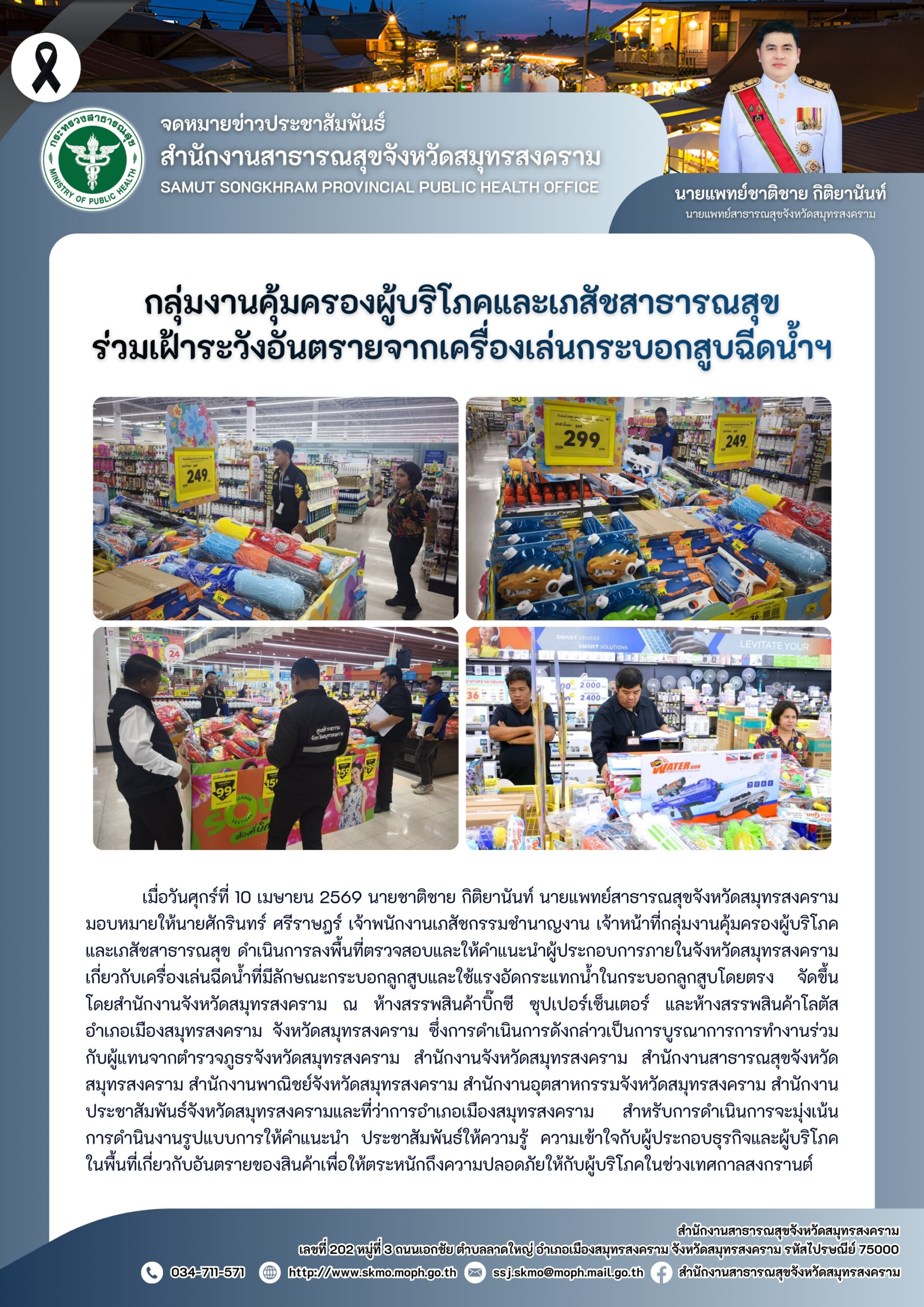 เมื่อวันศุกร์ที่ 10 เมษายน 2569 นายชาติชาย กิติยานันท์ นายแพทย์สาธารณสุขจังหวัดสมุทรสงคราม มอบหมายให้นายศักรินทร์ ศรีราษฎร์ เจ้าพนักงานเภสัชกรรมชำนาญงาน เจ้าหน้าที่กลุ่มงานคุ้มครองผู้บริโภคและเภสัชสาธารณสุข ดำเนินการลงพื้นที่ตรวจสอบและให้คำแนะนำผู้ประกอบการภายในจังหวัดสมุทรสงครามเกี่ยวกับเครื่องเล่นฉีดน้ำที่มีลักษณะกระบอกลูกสูบและใช้แรงอัดกระแทกน้ำในกระบอกลูกสูบโดยตรง จัดขึ้นโดยสำนักงานจังหวัดสมุทรสงคราม ณ ห้างสรรพสินค้าบิ๊กซี ซุปเปอร์เซ็นเตอร์ และห้างสรรพสินค้าโลตัส อำเภอเมืองสมุทรสงคราม จังหวัดสมุทรสงคราม ซึ่งการดำเนินการดังกล่าวเป็นการบูรณาการการทำงานร่วมกับผู้แทนจากตำรวจภูธรจังหวัดสมุทรสงคราม สำนักงานจังหวัดสมุทรสงคราม สำนักงานสาธารณสุขจังหวัดสมุทรสงคราม สำนักงานพาณิชย์จังหวัดสมุทรสงคราม สำนักงานอุตสาหกรรมจังหวัดสมุทรสงคราม สำนักงานประชาสัมพันธ์จังหวัดสมุทรสงครามและที่ว่าการอำเภอเมืองสมุทรสงคราม สำหรับการดำเนินการจะมุ่งเน้นการดำนินงานรูปแบบการให้คำแนะนำ ประชาสัมพันธ์ให้ความรู้ ความเข้าใจกับผู้ประกอบธุรกิจและผู้บริโภคในพื้นที่เกี่ยวกับอันตรายของสินค้าเพื่อให้ตระหนักถึงความปลอดภัยให้กับผู้บริโภคในช่วงเทศกาลสงกรานต์