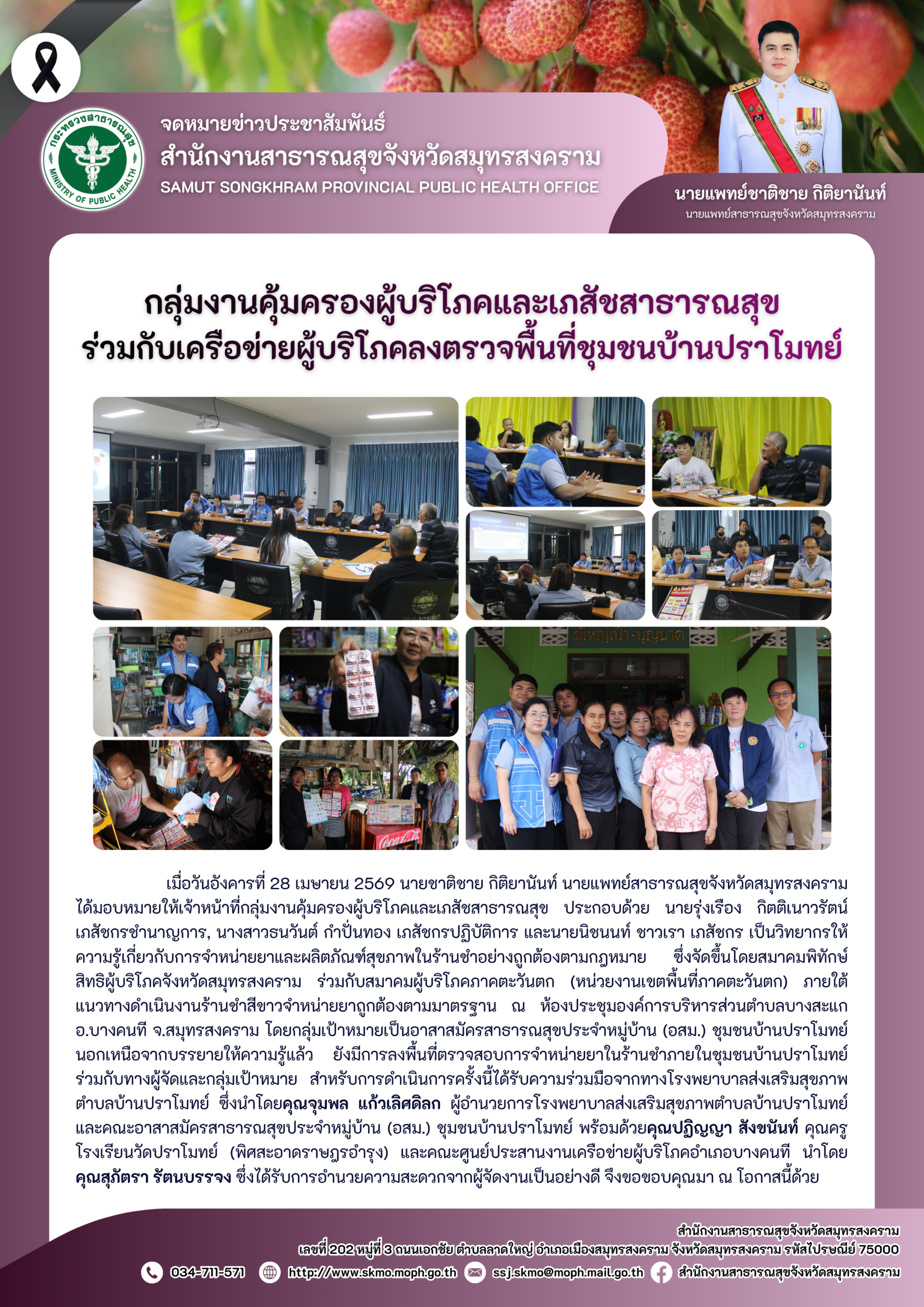 เมื่อวันอังคารที่ 28 เมษายน 2569 นายชาติชาย กิติยานันท์ นายแพทย์สาธารณสุขจังหวัดสมุทรสงคราม ได้มอบหมายให้เจ้าหน้าที่กลุ่มงานคุ้มครองผู้บริโภคและเภสัชสาธารณสุข ประกอบด้วย นายรุ่งเรือง กิตติเนาวรัตน์ เภสัชกรชำนาญการ, นางสาวธนวันต์ กำปั่นทอง เภสัชกรปฏิบัติการ และนายนิชนนท์ ชาวเรา เภสัชกร เป็นวิทยากรให้ความรู้เกี่ยวกับการจำหน่ายยาและผลิตภัณฑ์สุขภาพในร้านชำอย่างถูกต้องตามกฎหมาย ซึ่งจัดขึ้นโดยสมาคมพิทักษ์สิทธิผู้บริโภคจังหวัดสมุทรสงคราม ร่วมกับสมาคมผู้บริโภคภาคตะวันตก (หน่วยงานเขตพื้นที่ภาคตะวันตก) ภายใต้แนวทางดำเนินงานร้านชำสีขาวจำหน่ายยาถูกต้องตามมาตรฐาน ณ ห้องประชุมองค์การบริหารส่วนตำบลบางสะแก อ.บางคนที จ.สมุทรสงคราม โดยกลุ่มเป้าหมายเป็นอาสาสมัครสาธารณสุขประจำหมู่บ้าน (อสม.) ชุมชนบ้านปราโมทย์ นอกเหนือจากบรรยายให้ความรู้แล้ว ยังมีการลงพื้นที่ตรวจสอบการจำหน่ายยาในร้านชำภายในชุมชนบ้านปราโมทย์ ร่วมกับทางผู้จัดและกลุ่มเป้าหมาย สำหรับการดำเนินการครั้งนี้ได้รับความร่วมมือจากทางโรงพยาบาลส่งเสริมสุขภาพตำบลบ้านปราโมทย์ ซึ่งนำโดยคุณจุมพล แก้วเลิศดิลก ผู้อำนวยการโรงพยาบาลส่งเสริมสุขภาพตำบลบ้านปราโมทย์ และคณะอาสาสมัครสาธารณสุขประจำหมู่บ้าน (อสม.) ชุมชนบ้านปราโมทย์ พร้อมด้วยคุณปฏิญญา สังขนันท์ คุณครู โรงเรียนวัดปราโมทย์ (พิศสะอาดราษฎรอำรุง) และคณะศูนย์ประสานงานเครือข่ายผู้บริโภคอำเภอบางคนที นำโดยคุณสุภัตรา รัตนบรรจง ซึ่งได้รับการอำนวยความสะดวกจากผู้จัดงานเป็นอย่างดี จึงขอขอบคุณมา ณ โอกาสนี้ด้วย