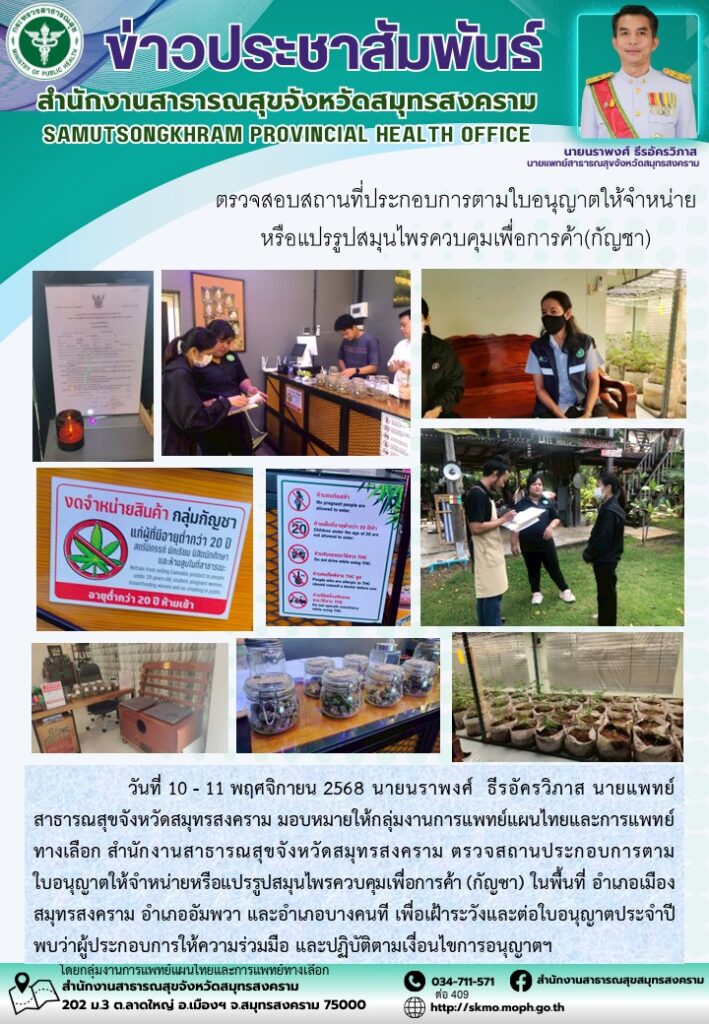 เมื่อวันที่ 30 ตุลาคม 2568 นายนราพงศ์ ธีรอัครวิภาส นายแพทย์สาธารณสุขจังหวัดสมุทรสงคราม มอบหมายให้เจ้าหน้าที่ของกลุ่มงานคุ้มครองผู้บริโภคและเภสัชสาธารณสุข สำนักงานสาธารณสุขจังหวัดสมุทรสงคราม ดำเนินการลงพื้นที่ตรวจร้านขายยาตามข้อปฏิบัติการเฝ้าระวังยาผิดกฎหมายและยาหมดอายุ จำนวน 9 แห่ง ได้แก่ ร้านยาพอเพียง, ร้านยาบ้านยา, ร้านยาทรงธรรมเภสัช, ร้านยาแหลมทองเภสัช 2, ร้านยาเภสัชเอี่ยว, ร้านยาเม็ดยาฟาร์มาซี, ร้านยาแม่กลองเภสัช, ร้านยาแก้วโสธรเภสัช และร้านยาคลังยาแม่กลอง สำหรับการลงพื้นที่ในครั้งนี้ได้รับความร่วมมือจากผู้ประกอบการเป็นอย่างดี จึงขอขอบคุณมา ณ โอกาสนี้