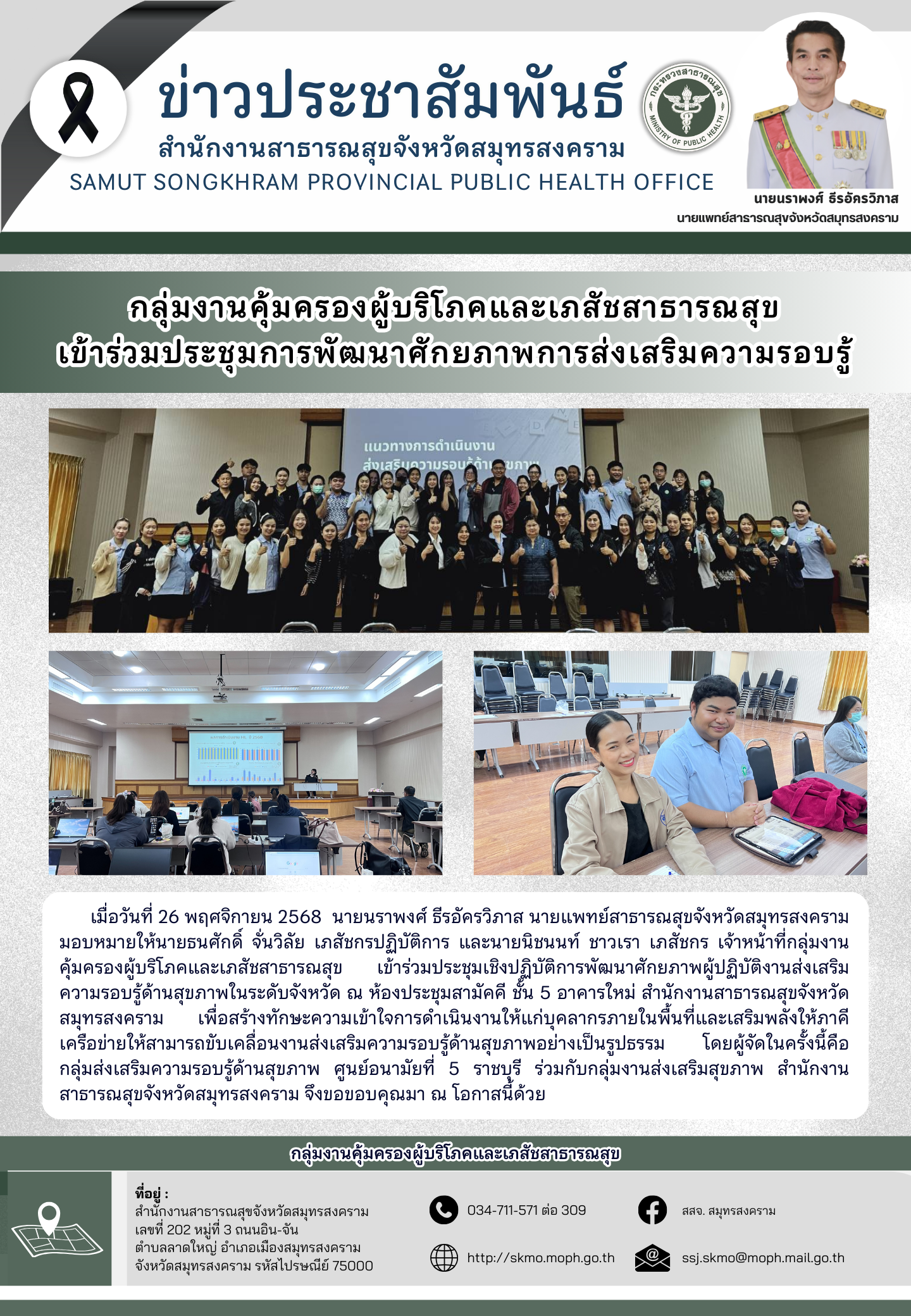 เมื่อวันที่ 26 พฤศจิกายน 2568 นายนราพงศ์ ธีรอัครวิภาส นายแพทย์สาธารณสุขจังหวัดสมุทรสงคราม มอบหมายให้นายธนศักดิ์ จั่นวิลัย เภสัชกรปฏิบัติการ และนายนิชนนท์ ชาวเรา เภสัชกร เจ้าหน้าที่กลุ่มงานคุ้มครองผู้บริโภคและเภสัชสาธารณสุข เข้าร่วมประชุมเชิงปฏิบัติการพัฒนาศักยภาพผู้ปฏิบัติงานส่งเสริมความรอบรู้ด้านสุขภาพในระดับจังหวัด ณ ห้องประชุมสามัคคี ชั้น 5 อาคารใหม่ สำนักงานสาธารณสุขจังหวัดสมุทรสงคราม เพื่อสร้างทักษะความเข้าใจการดำเนินงานให้แก่บุคลากรภายในพื้นที่และเสริมพลังให้ภาคีเครือข่ายให้สามารถขับเคลื่อนงานส่งเสริมความรอบรู้ด้านสุขภาพอย่างเป็นรูปธรรม โดยผู้จัดในครั้งนี้คือกลุ่มส่งเสริมความรอบรู้ด้านสุขภาพ ศูนย์อนามัยที่ 5 ราชบุรี ร่วมกับกลุ่มงานส่งเสริมสุขภาพ สำนักงานสาธารณสุขจังหวัดสมุทรสงคราม จึงขอขอบคุณมา ณ โอกาสนี้ด้วย
